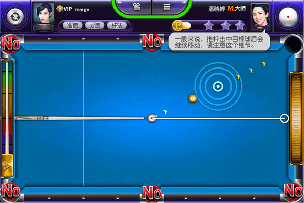 在这里,母球无法获得加塞和高低杆调整,玩家只能依靠角度和力度的调整,将球击入袋中。