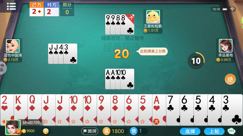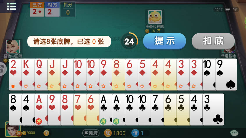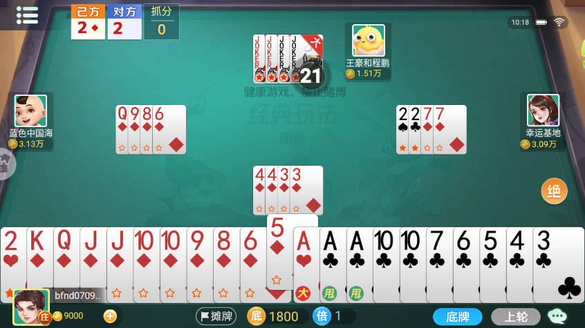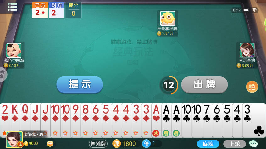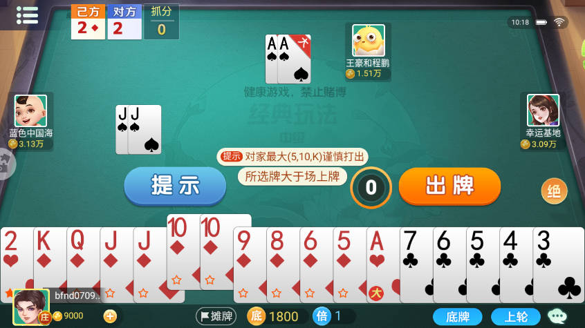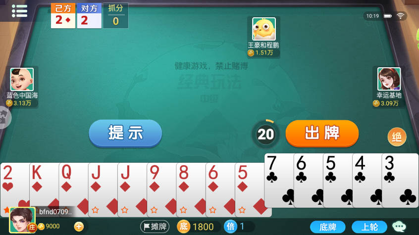 3、双扣特有规则,若某玩家牌出完且无人能接,下一轮则由其队友接续出牌。