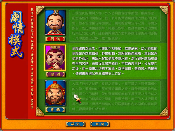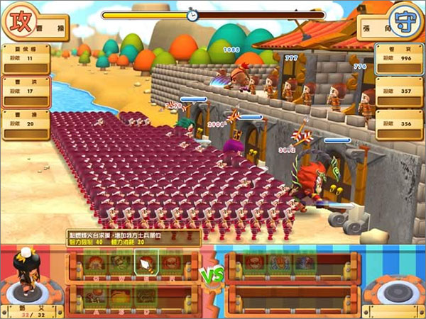 在前代中,每个主公都必需完成五个关卡才能统一天下;这次为了让玩家能一次玩个过瘾,每个主公都设计了十三个与众不同的关卡,以及三个隐藏关卡,来考验玩家的智慧。不管是扮演曹操、孙权或刘备,每个主公都必须带领各自的武将,采取各自的策略,完成所有的挑战。每个主公的关卡都充满着小组成员的精心巧思,例如有些关卡中,仅能派遣文官出战,考验玩家的应变功力;有些关卡必经要道上盖满敌人的箭塔,是要快步通过,还是打下箭塔我军的伤亡才能最低呢?有些关卡中,东奔西走总是逃不出敌人的势力范围,只有花钱开通新路才能逃出生天。每一个关卡都有其特殊的战略意义,上一关无往不利的策略,在这一关可能就行不通了。这些关卡不仅代表着游戏的丰富性,也产生了不同的游戏乐趣。