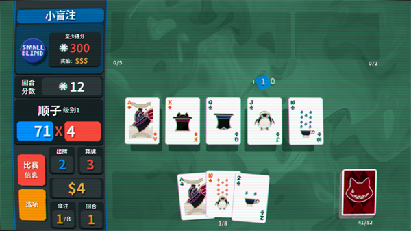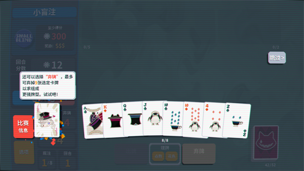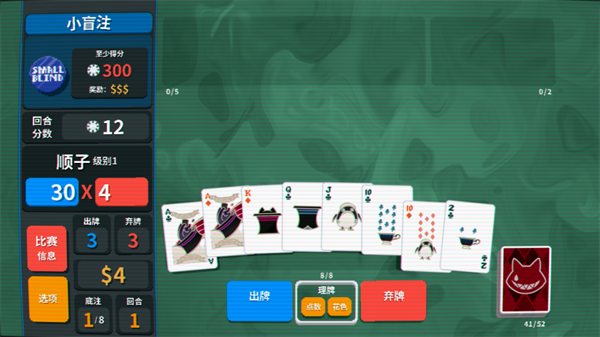 玩家初始携带一个52张扑克的牌组,手中始终有8张牌,出牌或弃牌后会自动补满,但次数均有限制。