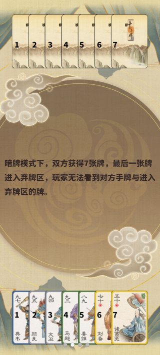 2、暗牌模式下,双方获得7张牌,最后一张牌进入弃牌区,玩家无法看到对方手牌和进入弃牌区的牌。