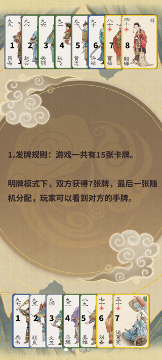 1、游戏一共有15张卡牌。明牌模式下,双方获得7张牌,最后一张牌随机分配,每位玩家可以看到对方的手牌。