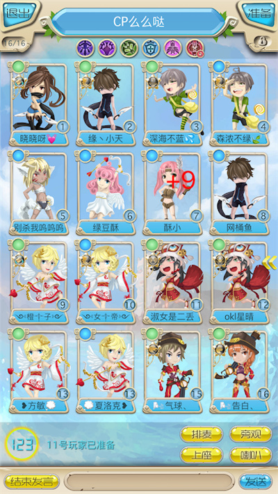 角色技能:当晚上裁判提示"丘比特请执行动作"时,丘比特可以通过依次点击两个玩家头像,将二者设置为恋人,两个非狼人相恋则代表好人,两狼人相恋则依然代表狼人,一狼人与一好人相恋则与丘比特共同成为第三方阵营。