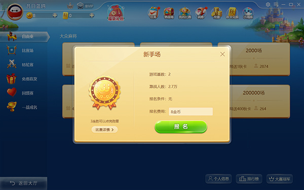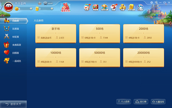 4、选择玩法模式,这里提供了新手场、500场等;