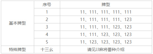 小于五:牌型由序数牌1-4的顺子、刻子、将牌组成。