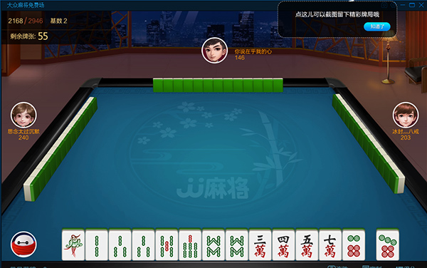 B、积分分摊(经典): 胡牌共需5手牌,如果所胡牌中有吃,碰,明杠的情况发生,其来源分别支付相应比例的分值(每手20%),剩余部分由点炮玩家支付(自摸时其他三位玩家平摊剩余部分)。