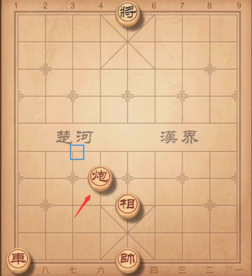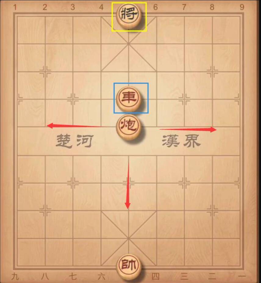 3、炮的走棋和车一样没有限制,可以沿着直线前后左右走棋;但是炮在吃子的时候有限制,它需要有“炮架子”才能“隔山打牛”,进行吃子。如图中,车是炮的炮架子,这时炮就可以吃点黄色框住的将,如下所示。