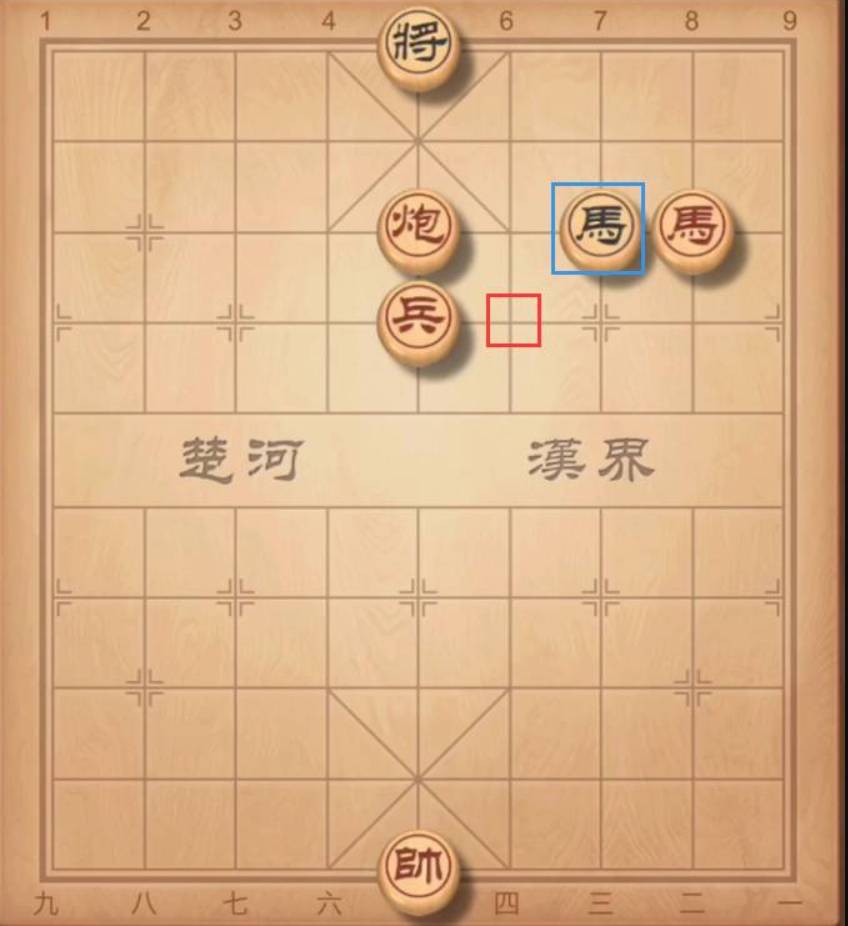 5、马这个棋子走棋还有“蹩脚马”的规则,如图所示,蓝色框的位置如果有棋,红色的马就不能跳的红色框的地方。