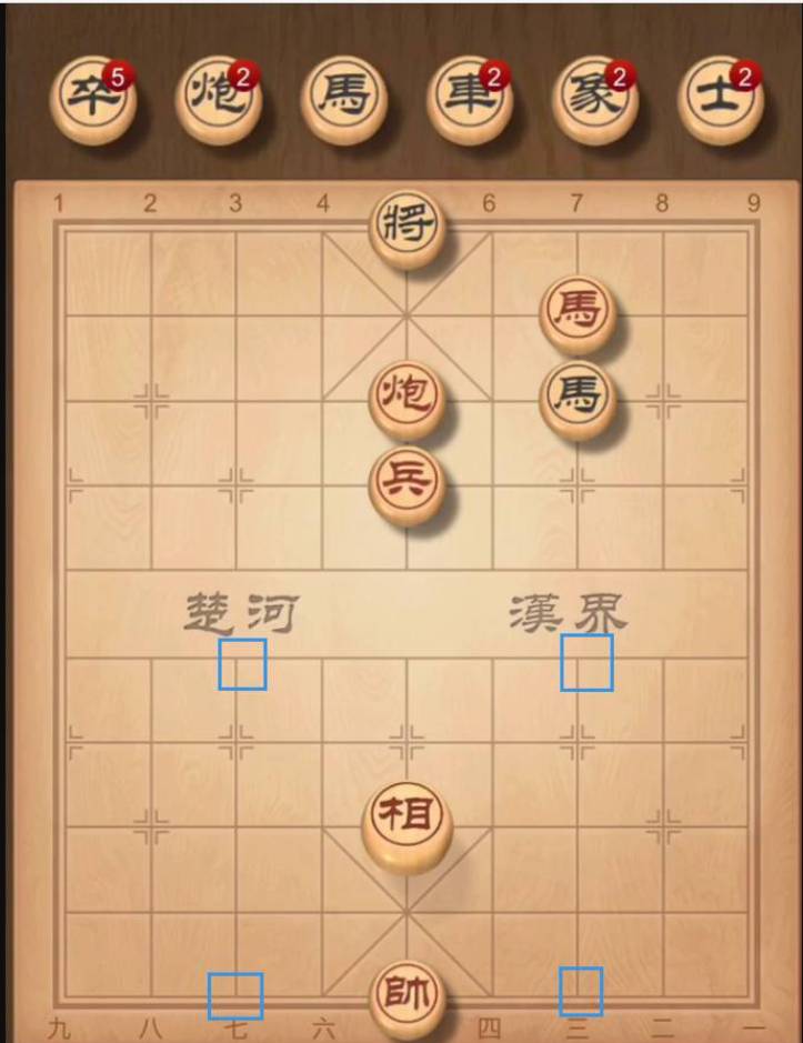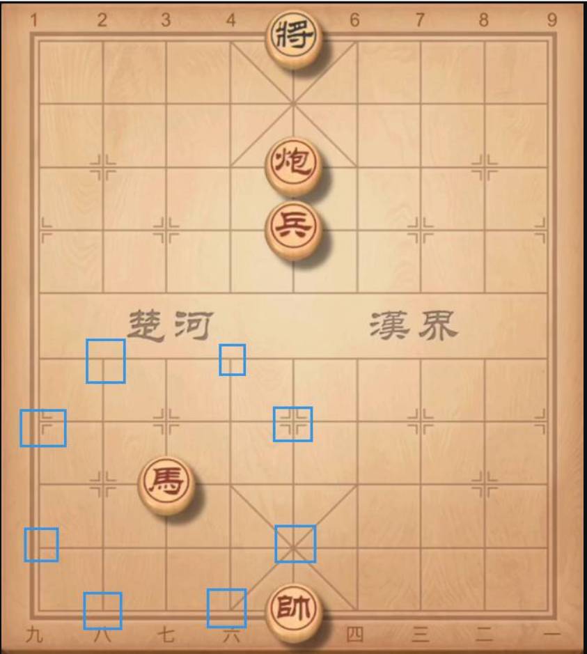 4、马这个棋子是走“日”字,沿着“日”字的对角线走,图中画蓝色框的地方都是马可以走的地方。
