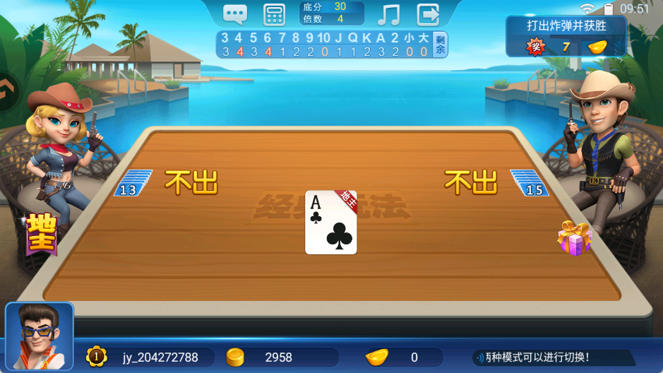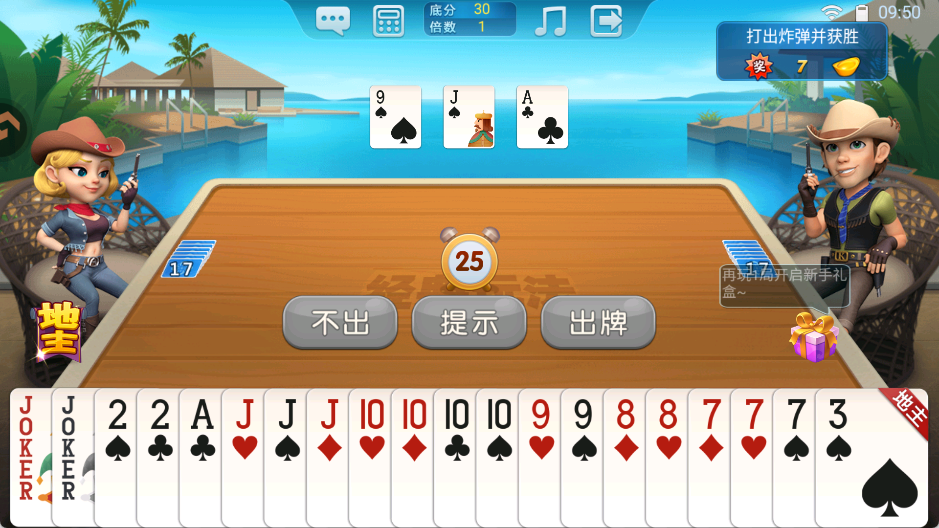 3、对局过程中,可在牌桌上通过滑动方式一次性选中多张牌;叫分环节用于争夺地主身份,最终由出价最高的玩家成为本局地主。