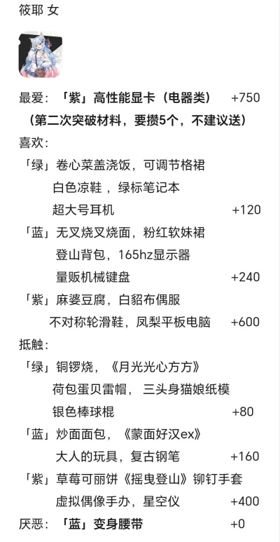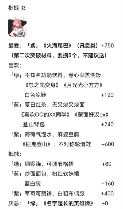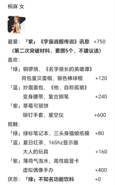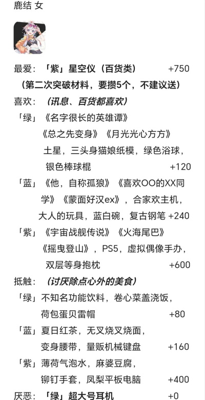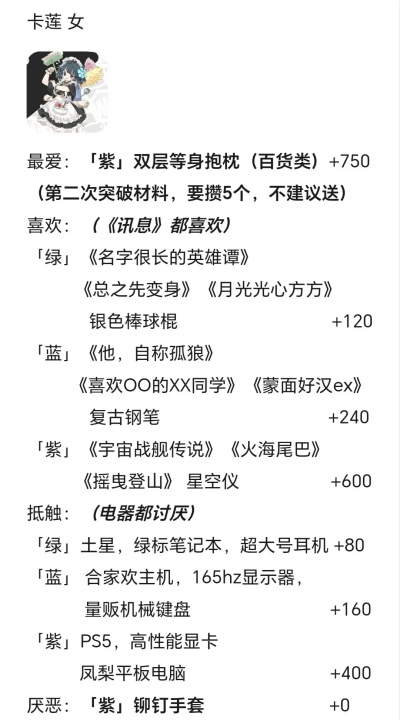 3.角色“喜欢”或“抵触”的一般为某一类别的某一系列(一视同仁and爱屋及乌.jpg),“最爱”的紫色礼物的所属系列的其余两个必为“喜欢”。