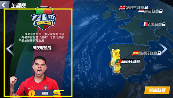 玩法活动获取:生涯赛是前期普通玩家获取球员更换阵容最主要的方式,前期努力提升战力通关葡萄牙联赛就能拿到几个A级以上球员和S-的佩佩,后续通关其他还有S+球员的产出,但难度就偏高了;经典赛通关部分章节也有随机球员的产出,但由于会卡关,这里比较难拿到高评级的球员;排位赛和挑战赛可以通过积累玩法货币分别兑换S+德布劳内和范迪克,因此每天5次排位赛都要打满,挑战赛也尽可能的多打;除了各种玩法,次日登陆领取的S评级的法布雷加斯、7日登陆二选一的马塔或J·罗德里格斯中也是前期很重要的比赛战力。