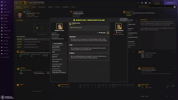 选择该选项后,您能与球员的经纪人快速交流。您有三个回复选项,每个选项都有不同的语气。选择“渴望”表明您非常希望将球员出售,而选择“有意”则表示您有出售的兴趣,但只有在合适的价格下才会考虑。而选择“好奇”则表示您只是在试探手头上的选择。