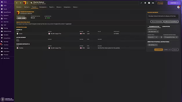 在初始回复后,您可以选择让经纪人开始推进转会。如果对潜在的价格或感兴趣的俱乐部不满意,也有其他选项供您选择。有一种情况是球员愿意离开但没有买家,经纪人则会解释原因。