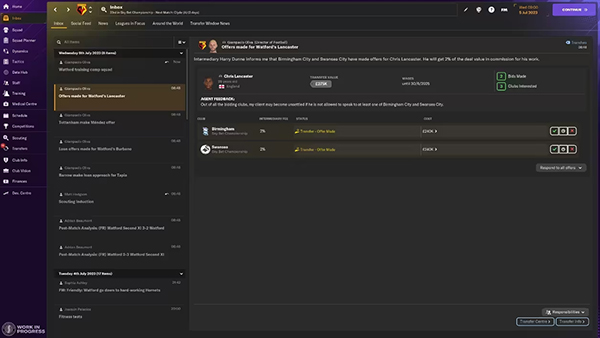 中介也会为其他俱乐部工作,这意味着如果其他俱乐部想要出售球员,他们会直接联系您。在这种情况下,您将收到一份球探报告,其中包含经纪人反馈和达成交易所需的财务细节概述。