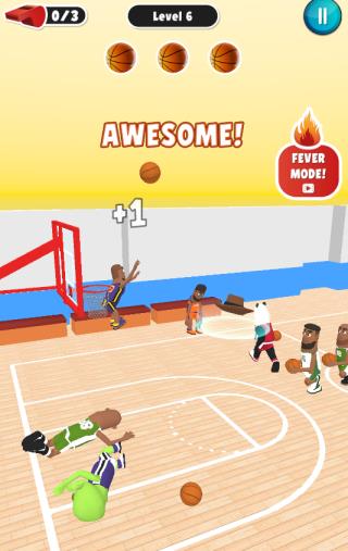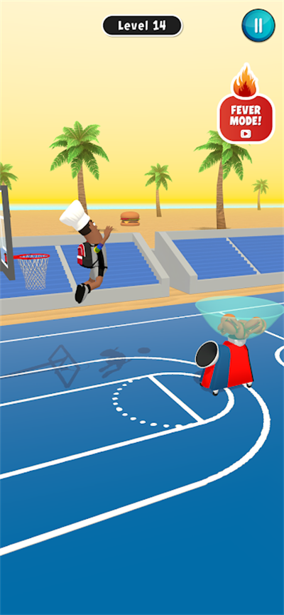 2、拖动角色起飞,瞄准篮筐,将篮球扔进篮筐,获得相应分数。