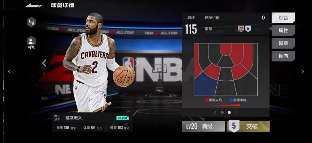 ②球员详情的综合中可以很清晰显示当前球员三分、中投、突破、篮板等偏向数值,右滑还会有该球员投篮热区及冷区。