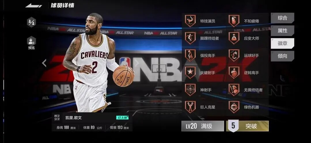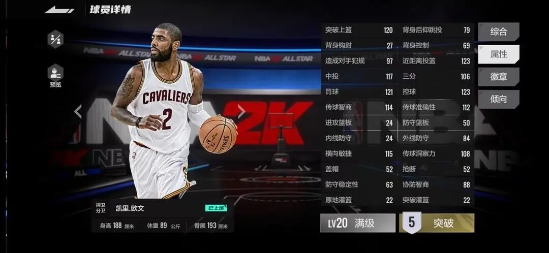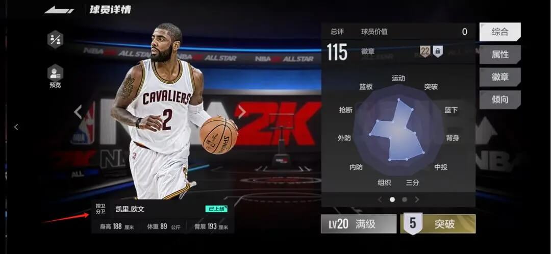 ①主页球员点击所选球员后进入球员详情,左侧点击预览,可以查看球员各等级、突破的综合、属性、徽章等数值。