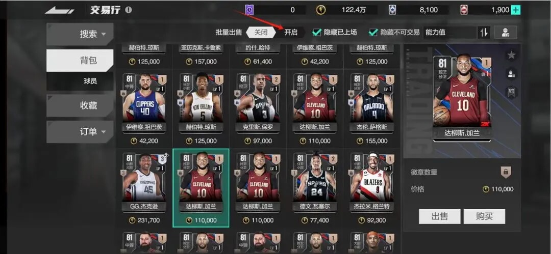 ④背包上方可以开启批量出售,选中不同的球员同时上架出售,提高效率
