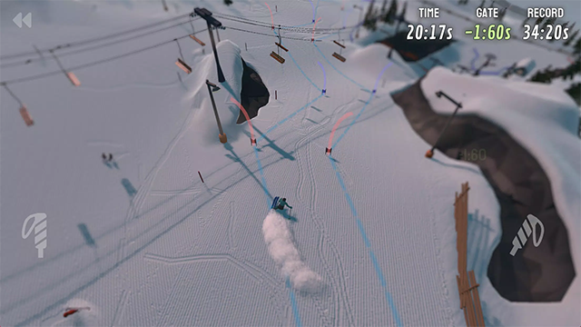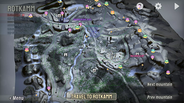 搭乘电梯前往Almhitte,尝试您的第一个回转挑战。完成挑战可以获得滑雪通行证,用于解锁滑雪缆车,将您带到山上的新部分。