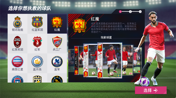 选择你想执教的球队,可挑选如 “红魔” 等风格各异的球队,不同球队有独特当家球星和背景,选队时可结合自身对球队风格的偏好来决定。