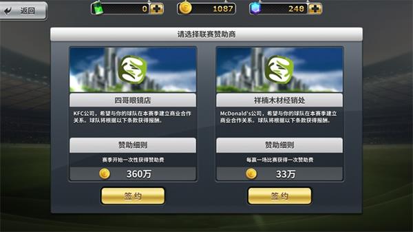 在联赛开始前可选择赞助商,赞助金额可一次性领取、或者每场比赛胜利后领取。这里面还是有学问的呢!