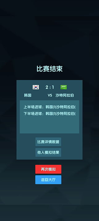 世界杯模拟器(word cup)是一款模拟足球世界杯比赛结果的体育游戏,玩家可以自主选择想要进行模拟对战的队伍,并且可以选定比赛进行时间,球场和当天的天气情况来模拟比赛结果,以文字的形式展现,不仅可以看到比赛全程,而且比赛记录可查看,从比分,射门,射正,角球,控球率,犯规,越位,黄牌,红牌等多个方面统计,让玩家一目了然,更加清晰明了,实时掌控比赛结果。让玩家感受到另类世界杯激情,用心仪的球队挑战全世界,感兴趣的玩家可以下载体验。
