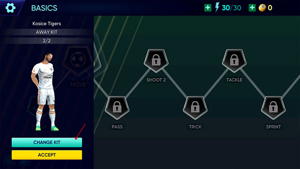 1、下载并安装足球世界杯官方版后,启动游戏并进入,选择自己喜欢的队员,点击“CHANGE KIT”更换球员装备。
